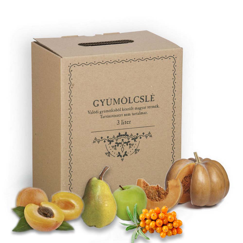 Összetétele: 40% almalé, 25% körtelé, 15% sárgabaracklé, 10 % sütőtöklé, 10 % homoktövislé.